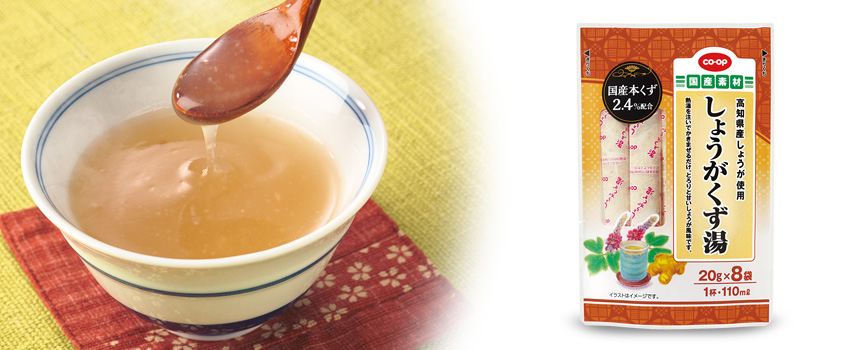 高知県産の生姜を丸ごとすりおろし、生姜粉末をブレンド。体が温まる、香る生姜のとろーりくず湯。本くず2.4%配合。