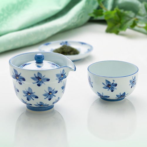 60℃程度のお湯で淹れる急須で、取手がないのが特徴です。その小柄ですっきりした急須に描かれた、呉須の花弁と金彩のメシベが白磁に映えて、瀟酒な雰囲気を漂わせます。
