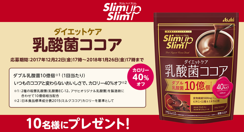 スリムアップスリム ダイエットケア乳酸菌ココアを抽選で10名様にプレゼントいたします。