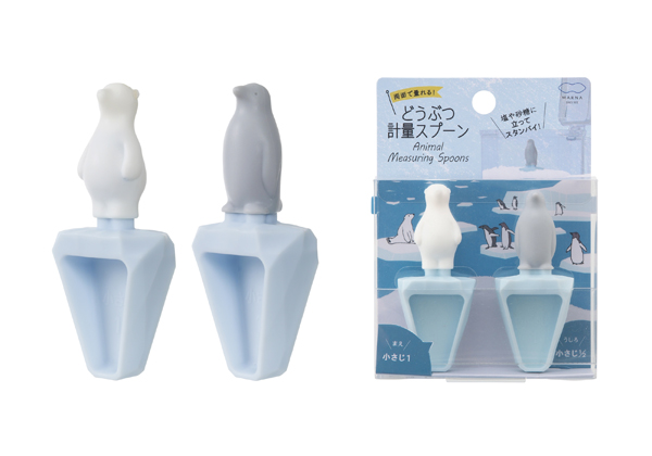 容器の側面ですりきりできて、小さじ1と小さじ1/2が、きっちり量れます。塩や砂糖を氷山に見立てたどうぶつモチーフの計量スプーンは、キッチンを楽しくしてくれます。