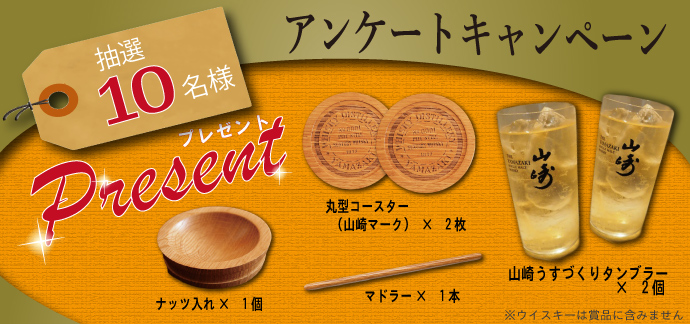 山崎うすづくりタンブラーペアなどを抽選で10名様にプレゼントいたします。