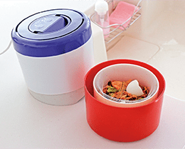生ごみを温風でパリパリにして減量する乾燥機。腐敗を抑えるのでいやなにおいを防ぎます。水切りネットは付けたままでも大丈夫。汁だれやコバエなどの害虫の悩みも解消するうえ、ごみ出しの回数も減少。