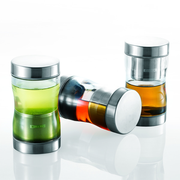 マグカップサイズのストレーナー付きツインキャップ水筒。ストレーナーにお茶や紅茶の葉を入れ、本体をひっくり返し反対側のキャップを開けてお湯を注ぐだけ。飲み切れないときはストレーナーを上にしておけばOK。