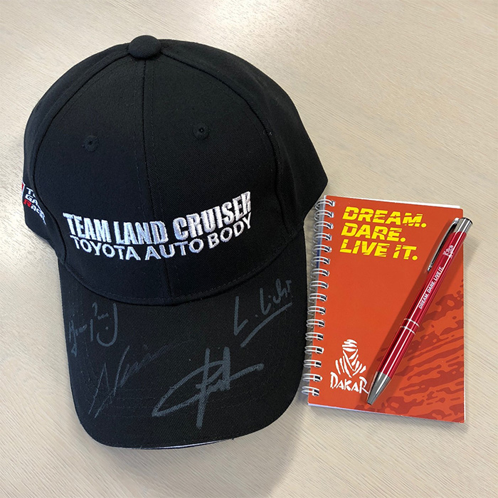 キャップとダカールラリーオリジナルミニノート・ペンのセットを抽選で4名様にプレゼントいたします。