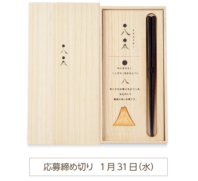 事が丸く収まるように、お箸の形は頭を丸く、末広がりの縁起を担いで持ち手からお箸の先まで八角に。末広がりの象徴、富士山のお箸置きとセットにした縁起の良いセットです。