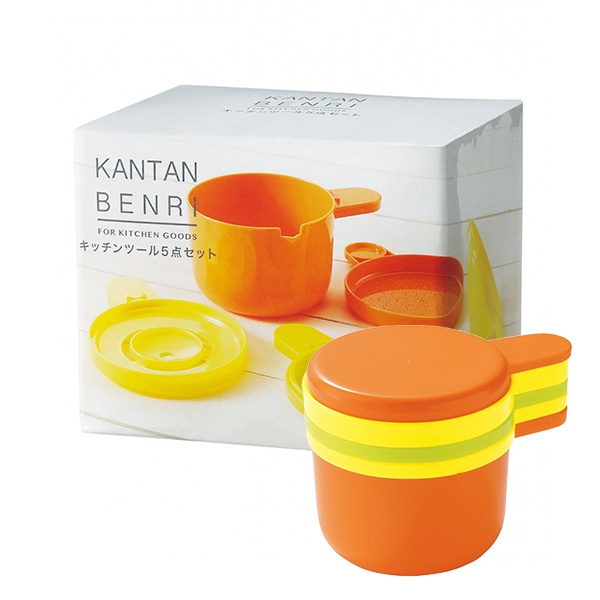 おろし器(細かめ、薬味などに)、エッグセパレーター、おろし器(粗め、大根などに)、ろうと、計量カップ(300cc)がひとつに重ねられるコンパクト設計。